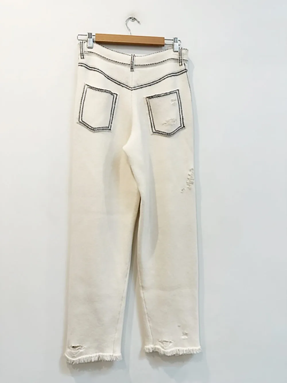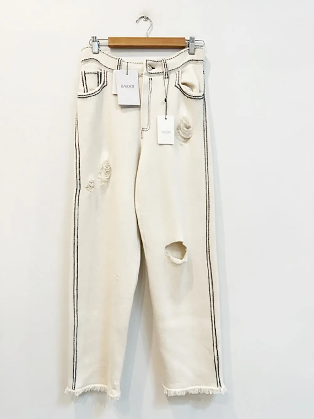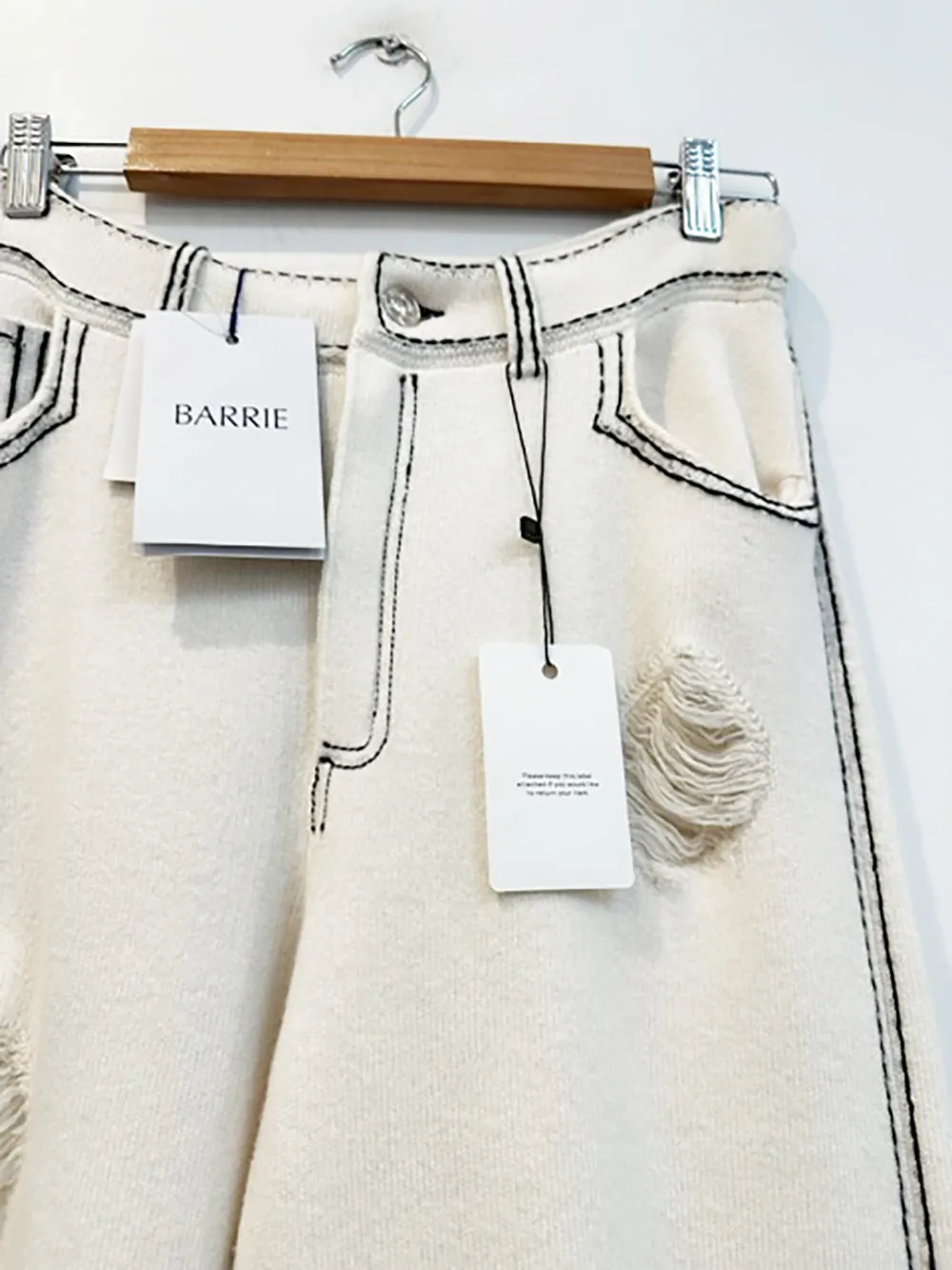 Just STUNNING BRAND NEW WITH TAGS luxury designer pants from Scotland IT label BARRIE. These are cool jean like knit pants. Knitted with luxury white cashmere and cool black top-stitching. Elastic waist band. Really clever distress detailing really add to the coolness! These retail over $2000, grab a bargain!
