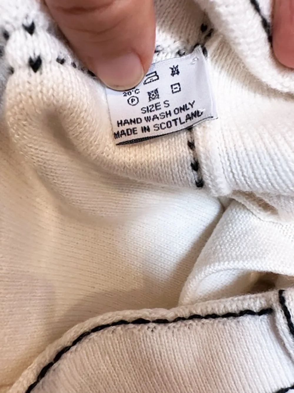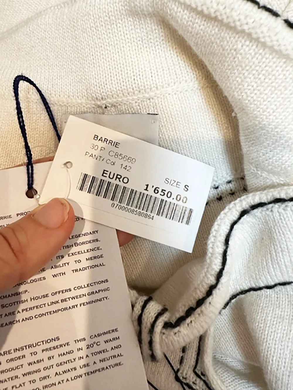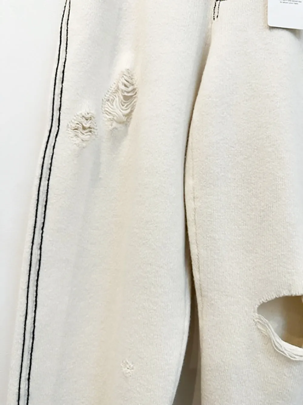 Just STUNNING BRAND NEW WITH TAGS luxury designer pants from Scotland IT label BARRIE. These are cool jean like knit pants. Knitted with luxury white cashmere and cool black top-stitching. Elastic waist band. Really clever distress detailing really add to the coolness! These retail over $2000, grab a bargain!