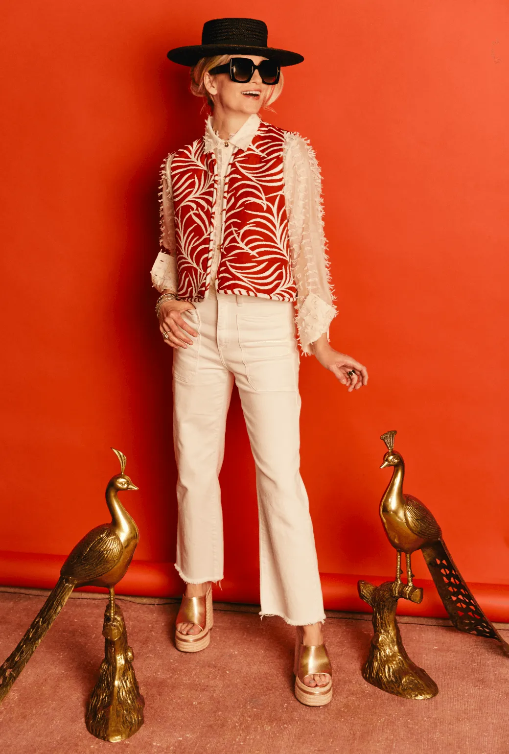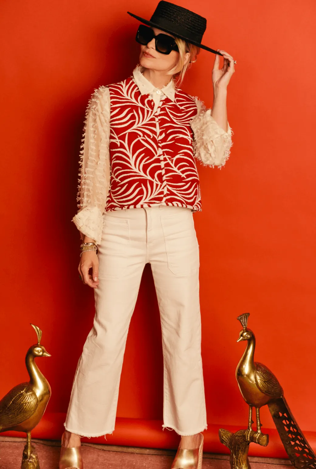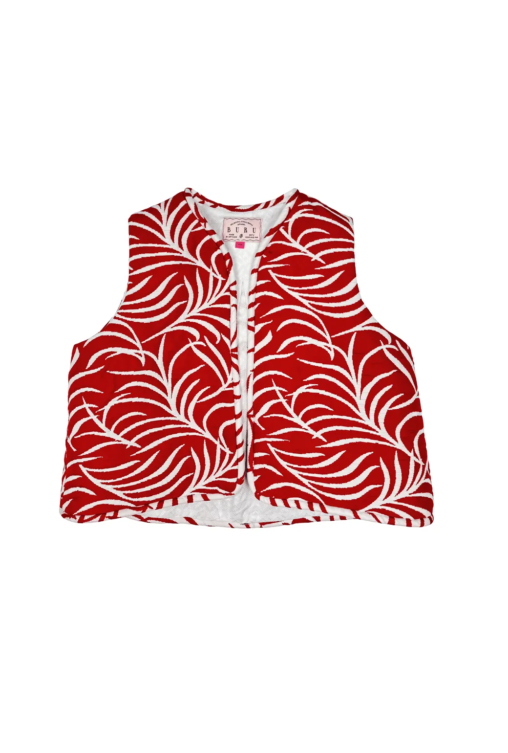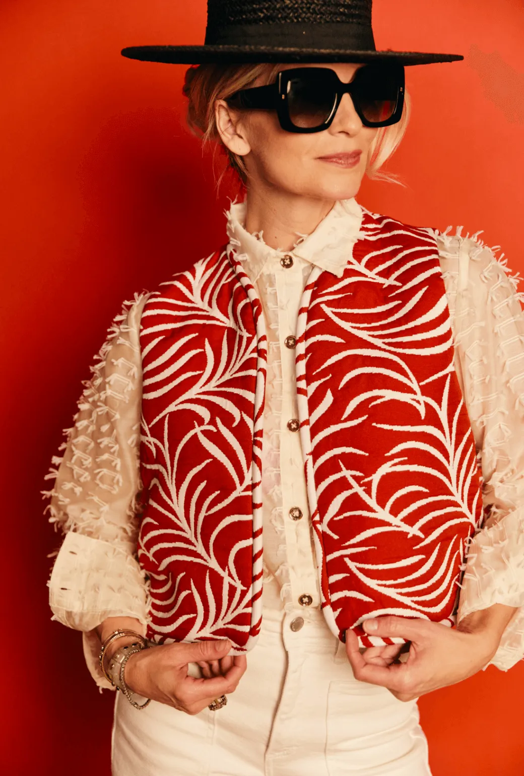 A simple way to change up your wardrobe is by layering an eye-catching vest over classic staples in your closet. Enter our new Cropped Vest in a bold Garnet and ivory jacquard. With a slightly narrow shoulder and purposeful volume, she'll add oomph to your favorite button down and jeans combo or interest to your turtleneck and party skirt look.