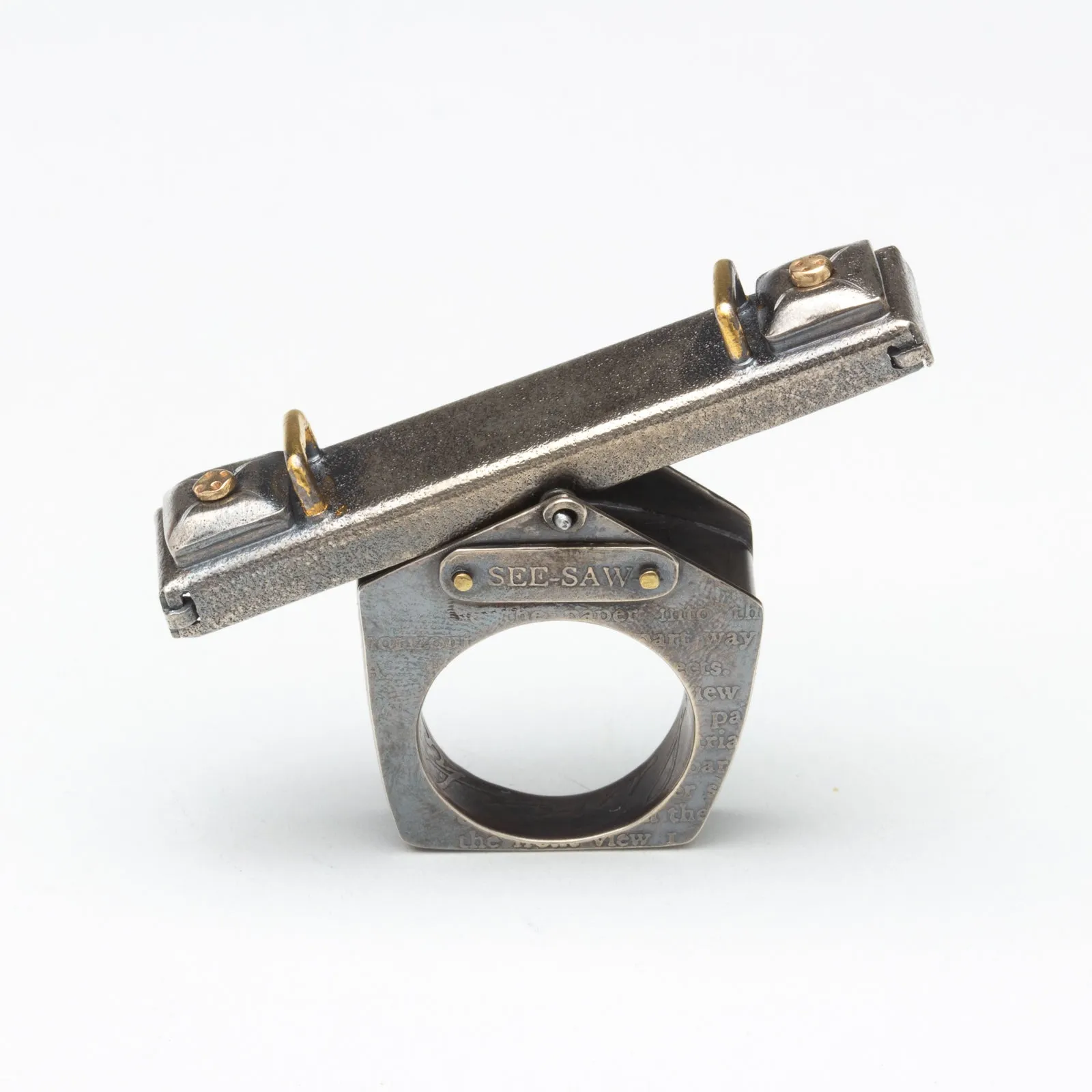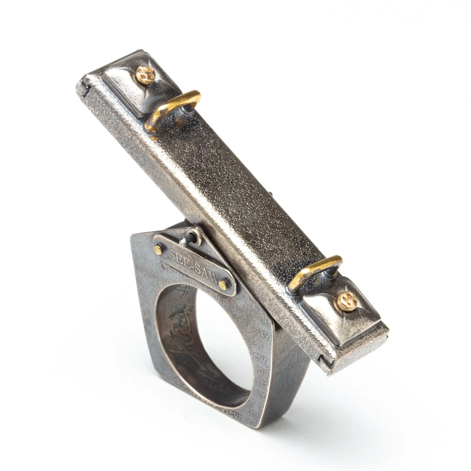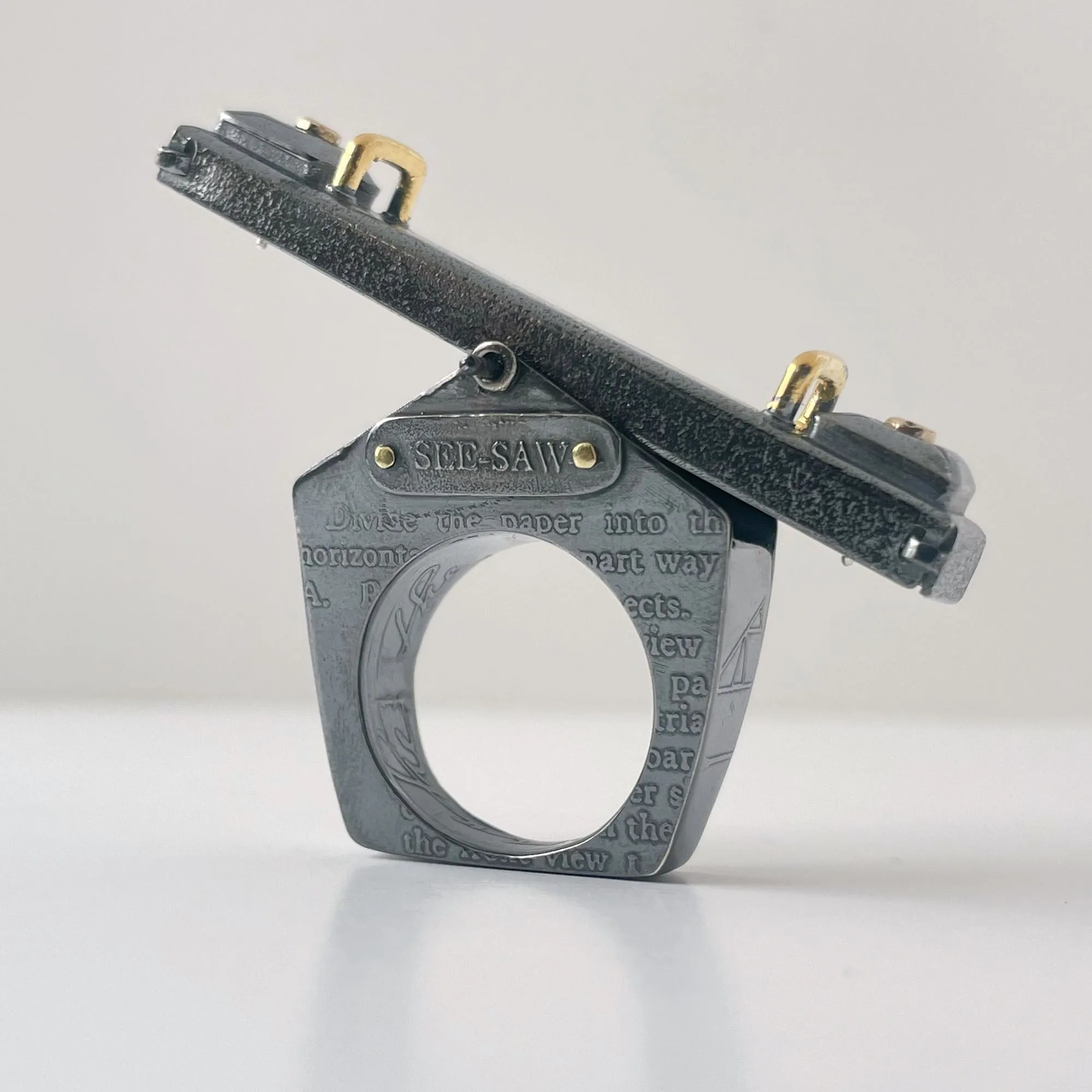 Artist Statement: See-Saw Sally is a hollow-formed and constructed fidget ring made of sterling silver, stainless steel, and gold. The ring itself is a 3D form inspired by a drawing from a book entitled Chicago High Schools Mechanical Drawing from 1925. The etchings on the exterior of See-Saw Sally come directly from pages 34 and 35 of that gorgeous book. Through my exploration of the playground, I often think of the see-saw as the perfect metaphor for how I attempt to manage my life. I’m up, I’m down, I’m crashing to the ground because of something out of my control. The See-Saw reflects the balance I am constantly trying to achieve. I love studying the simple mechanisms the playground has to offer and the see-saw is by far the simplest but most complex in measurement and balance. And because I am silly, See-Saw Sally features the tiniest 14k gold buttons on the pillows that one would sit upon if they were 2 inches tall. These tiny buttons can be removed and worn as earrings. Enjoy.