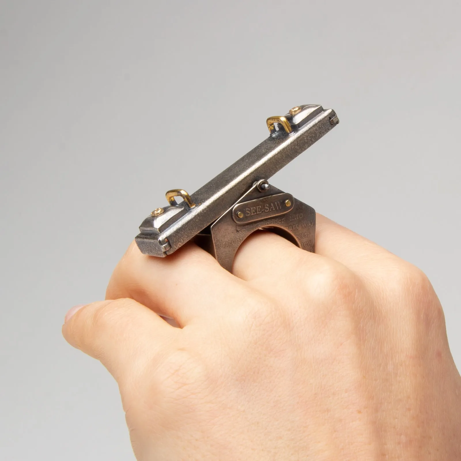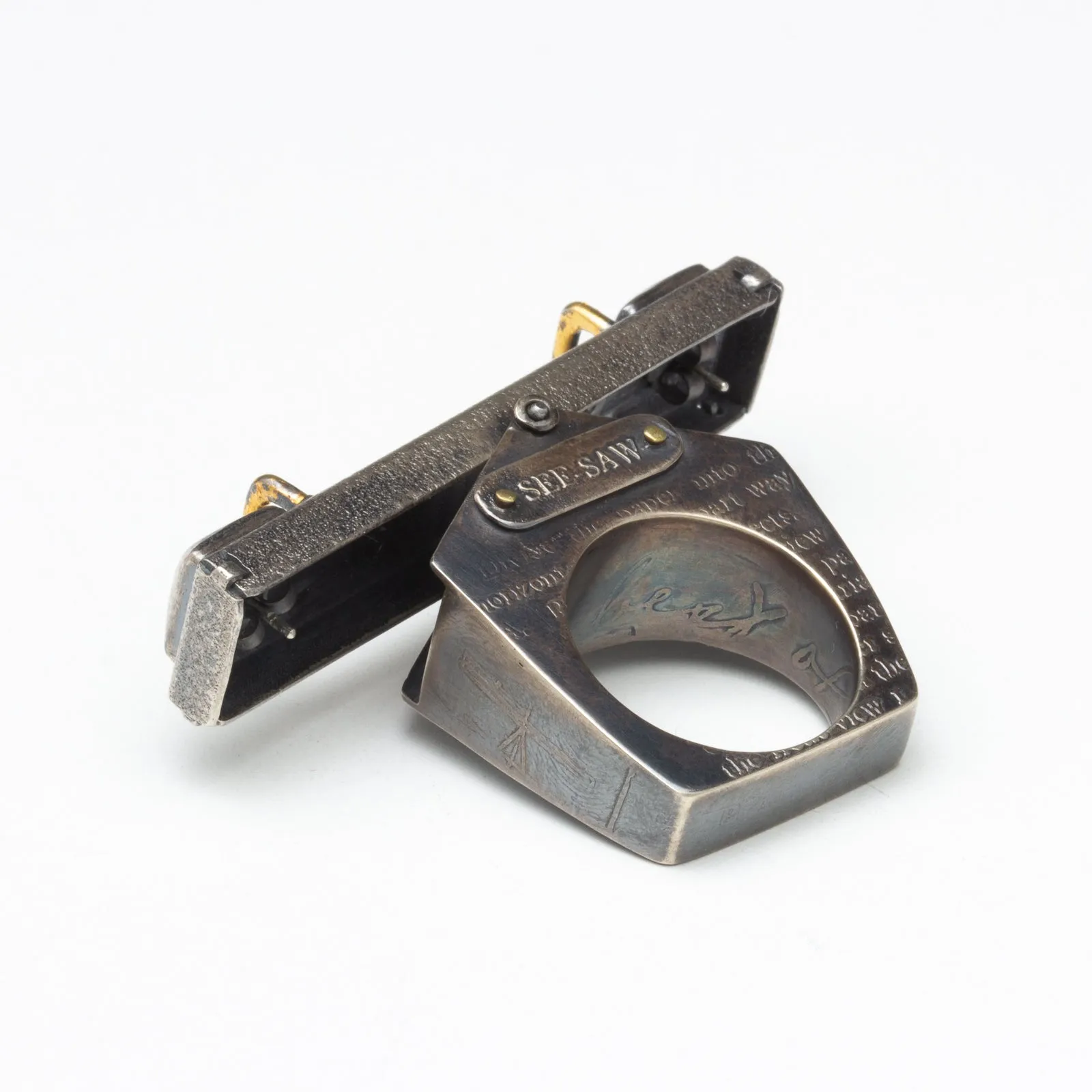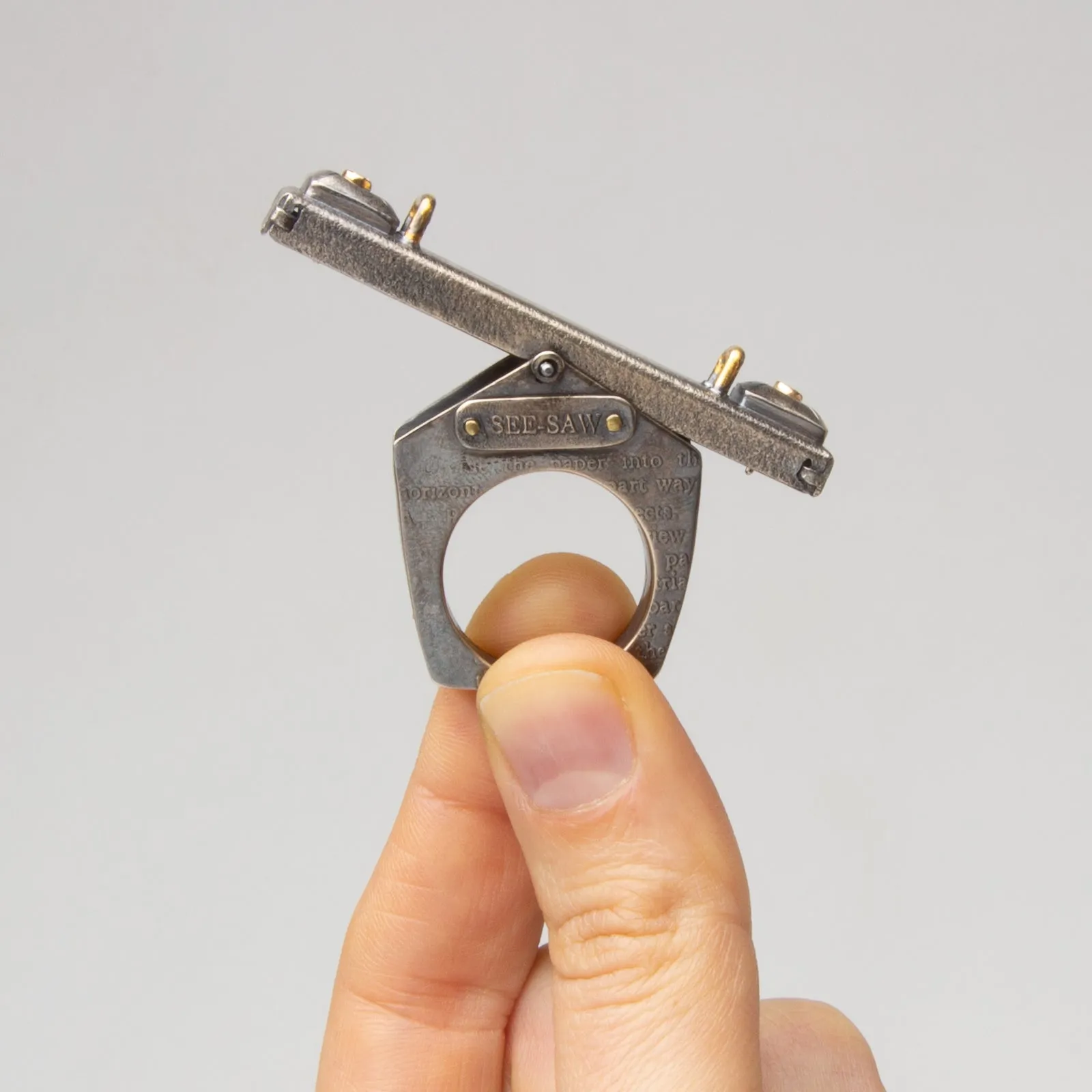 Artist Statement: See-Saw Sally is a hollow-formed and constructed fidget ring made of sterling silver, stainless steel, and gold. The ring itself is a 3D form inspired by a drawing from a book entitled Chicago High Schools Mechanical Drawing from 1925. The etchings on the exterior of See-Saw Sally come directly from pages 34 and 35 of that gorgeous book. Through my exploration of the playground, I often think of the see-saw as the perfect metaphor for how I attempt to manage my life. I’m up, I’m down, I’m crashing to the ground because of something out of my control. The See-Saw reflects the balance I am constantly trying to achieve. I love studying the simple mechanisms the playground has to offer and the see-saw is by far the simplest but most complex in measurement and balance. And because I am silly, See-Saw Sally features the tiniest 14k gold buttons on the pillows that one would sit upon if they were 2 inches tall. These tiny buttons can be removed and worn as earrings. Enjoy.