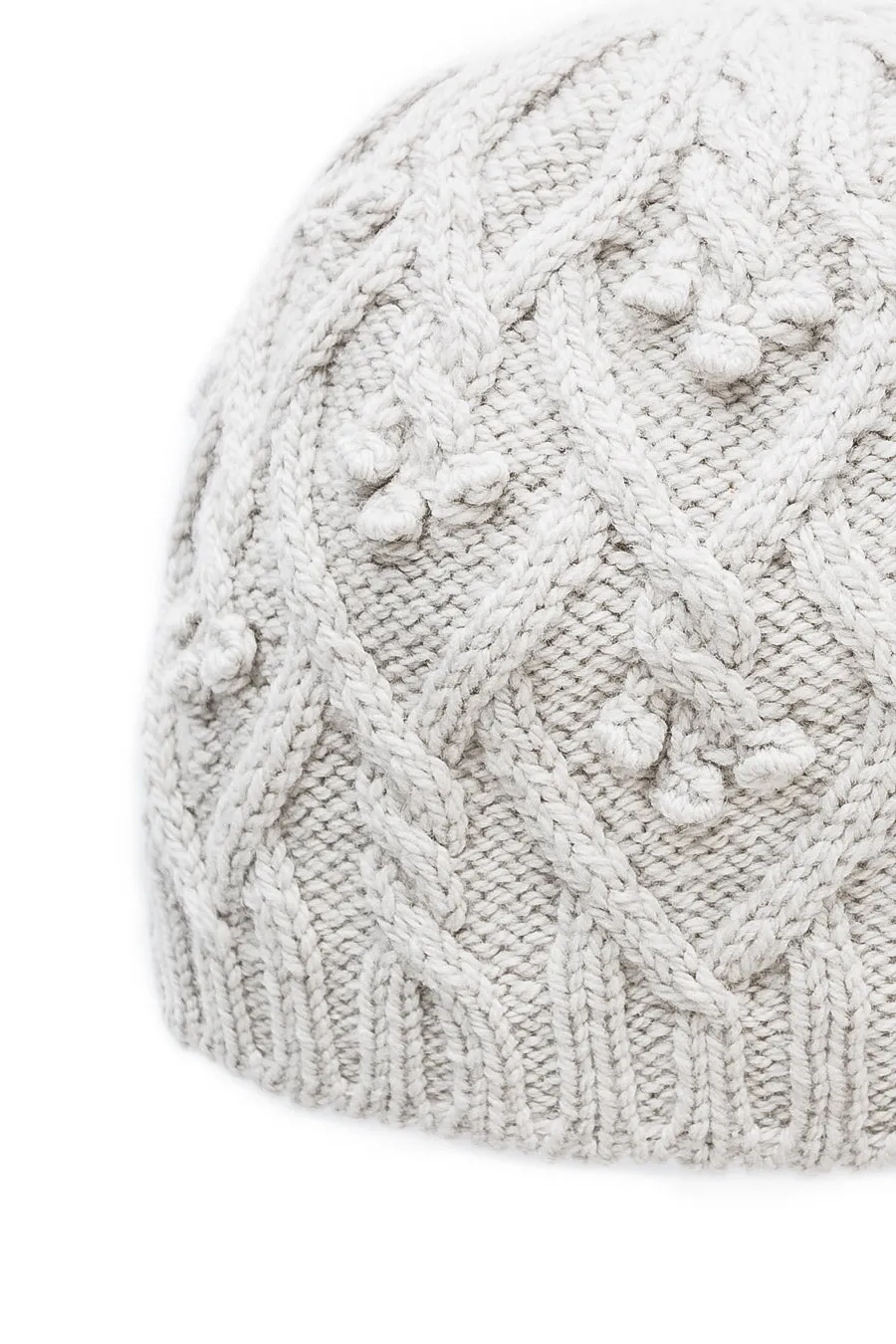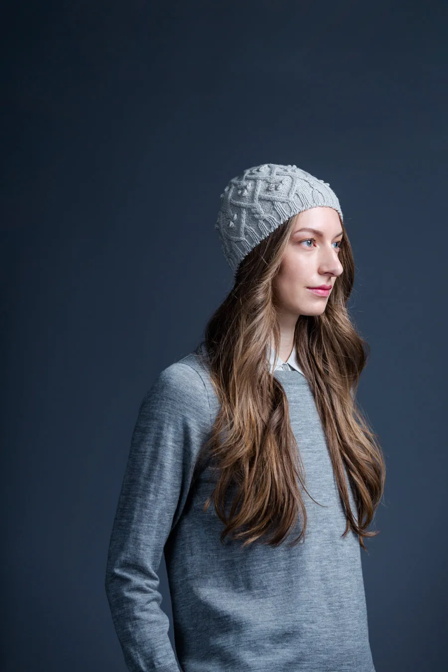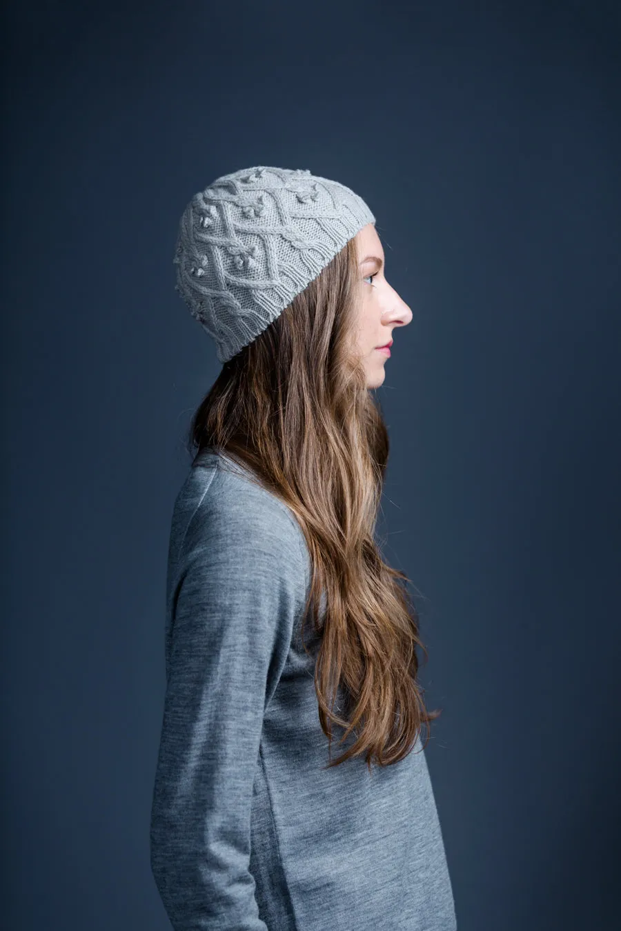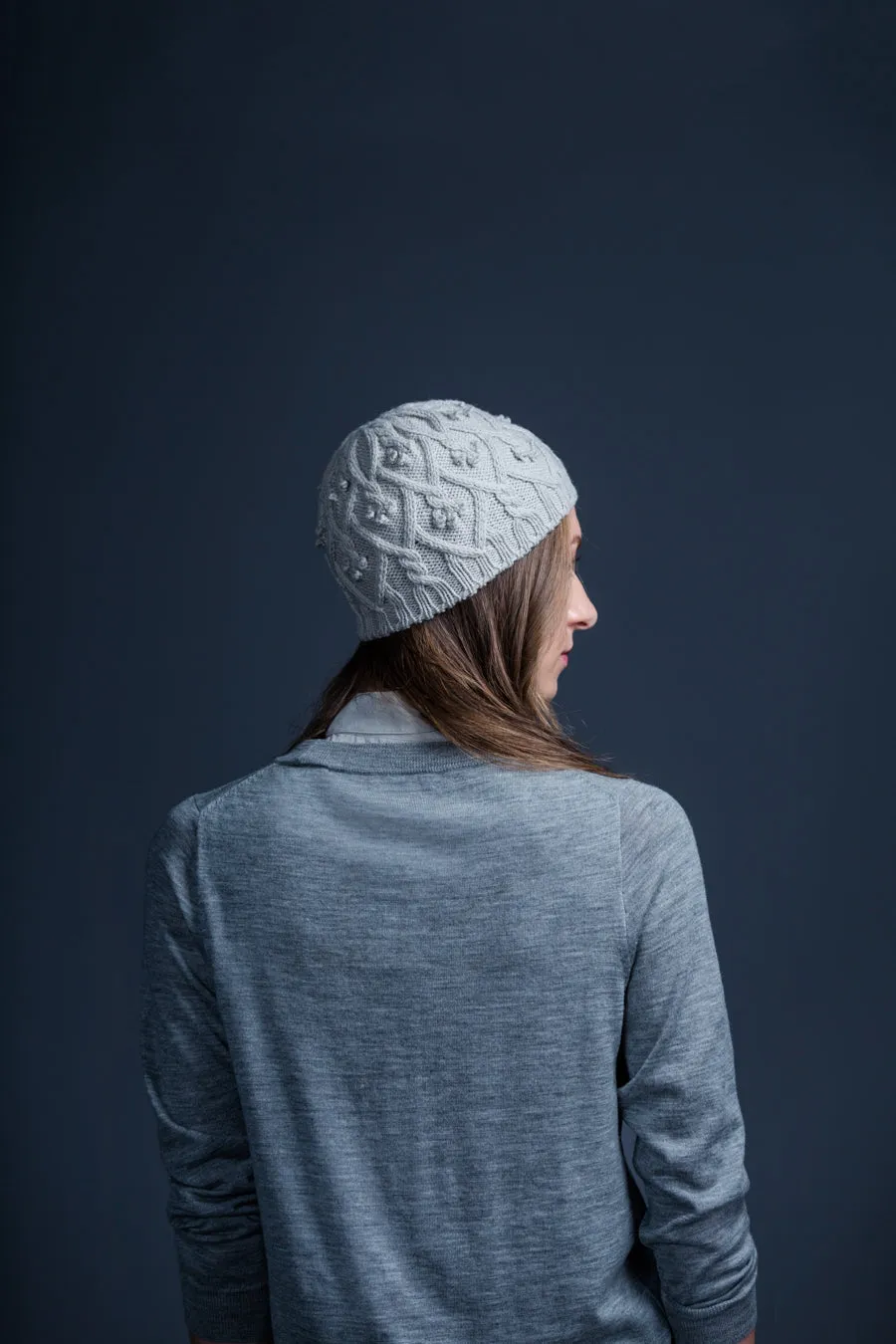 Pendant trios of bobbles framed in cable shields decorate this ornate hat. A ground of reverse stockinette throws the motifs into high relief and shows off Arbor’s capacity for rendering crisp stitchwork. Laurel is designed for a close fit; the elastic tubular cast-on and double-ribbed brim make it stretchy enough to fit most adult heads.