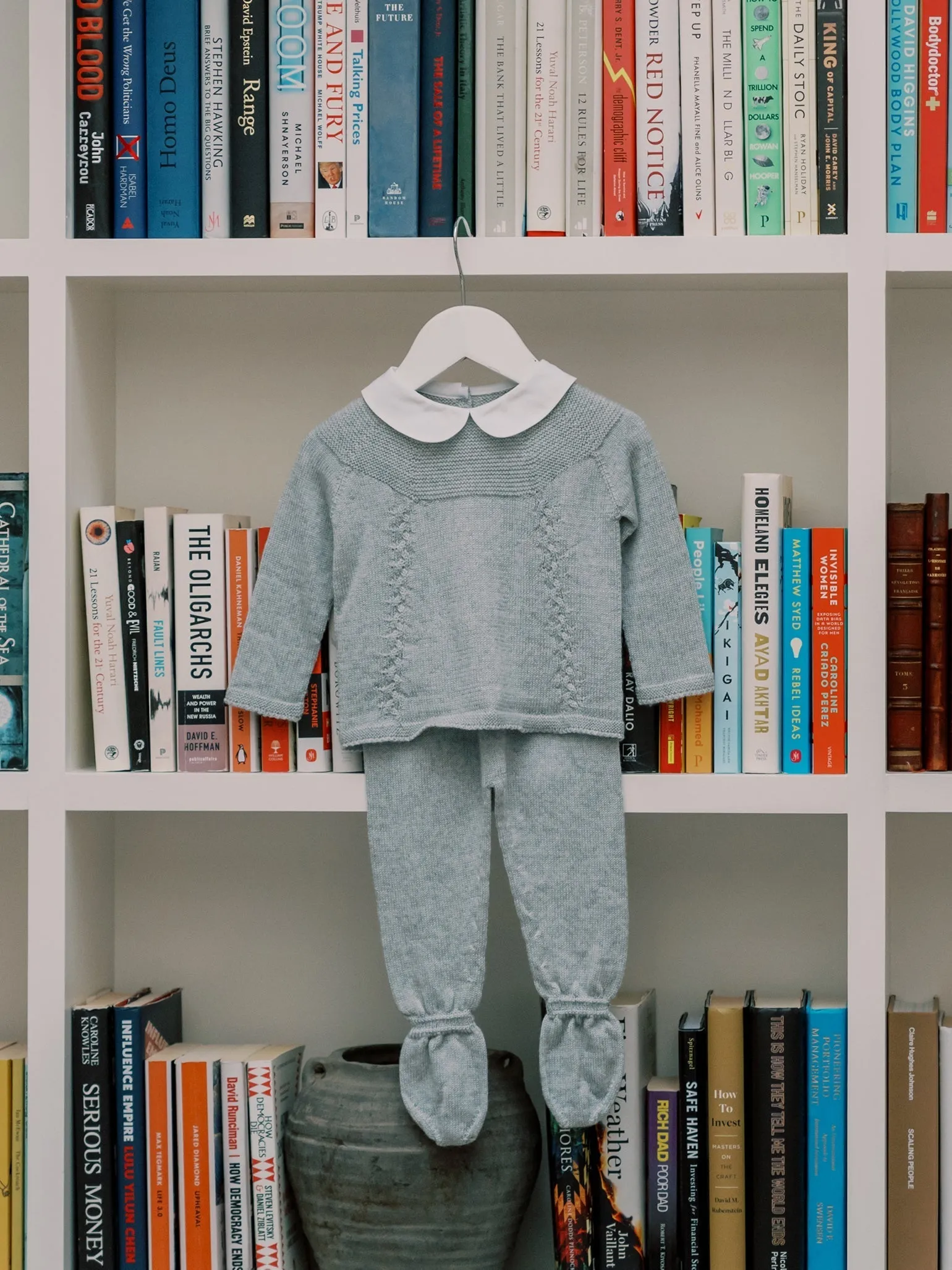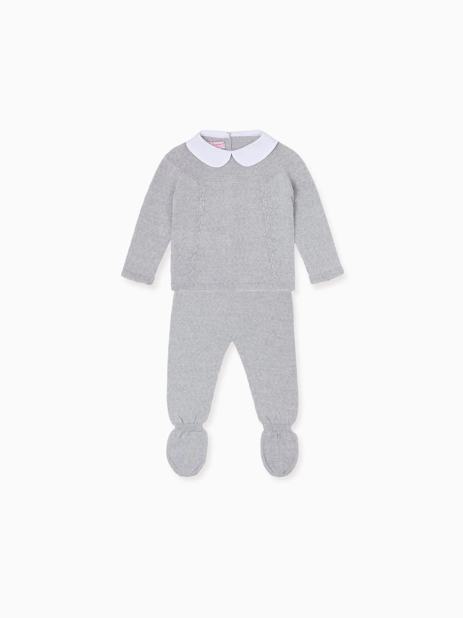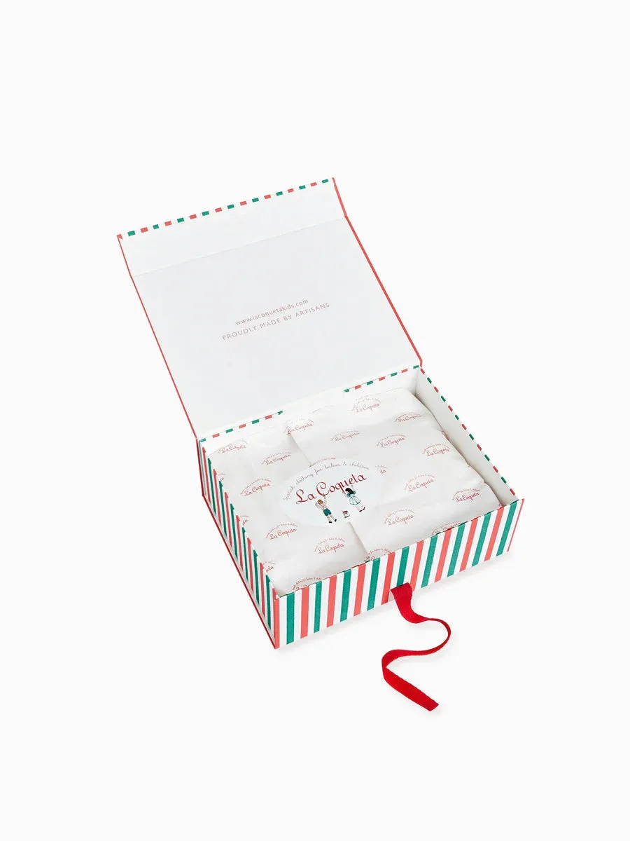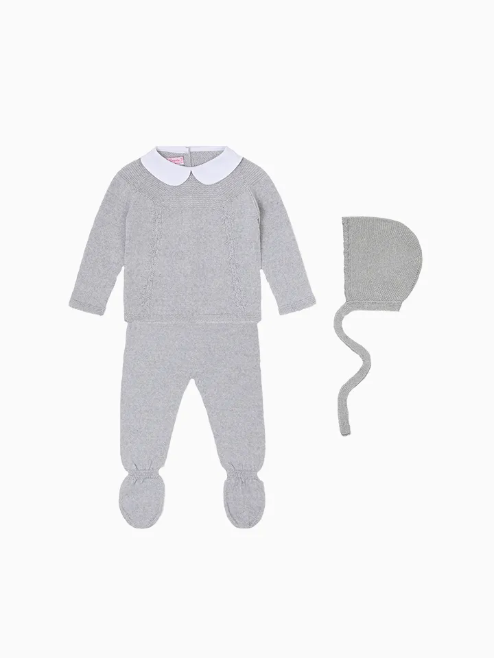 La Coqueta’s Florentina Merino Baby Girl Knitted Gift Box Set is thoughtfully designed to prioritise your newborn's comfort and well-being. It's designed with your newborn's well-being in mind, opting for pure Merino knits with a fine gauge that has the softest handle and is kind to even the most delicate skin. Our charming sets are proudly made in Spain at family-owned ateliers, handcrafted with the utmost care and attention to detail. This light grey melange three-piece set is perfect for those early months with your little one, offering total comfort all day long. The sweater has dropped shoulders and long sleeves, with intricate garter stitching along the yoke, cable knit details, and a statement Peter Pan collar in crisp cotton and mother of pearl buttons to fasten at the back. Finished with chunky ribbed trims, it has matching leggings with attached booties for extra comfort, and it's paired with the matching Olfa Merino Baby Knitted Bonnet in light grey melange. This gift set is beautifully presented in FSC-certified branded tissue paper within La Coqueta’s iconic red and green stripe pattern and luxuriously tied with a red ribbon. All La Coqueta gift boxes are FSC-certified and fully recyclable.