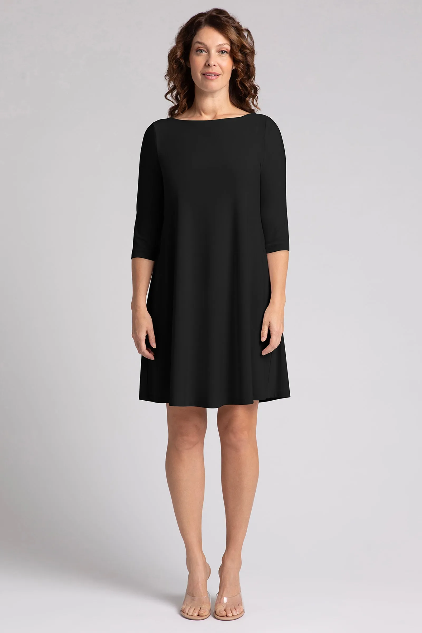 Our all-time favourite Nu Trapeze Dress boasts a modern design with 3/4 length sleeves and a flattering fit-and-flare silhouette. Its high neckline adds versatility, making it suitable for year-round wear. It includes practical inseam pockets for added functionality.