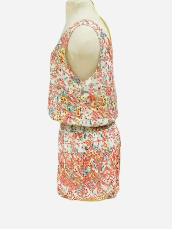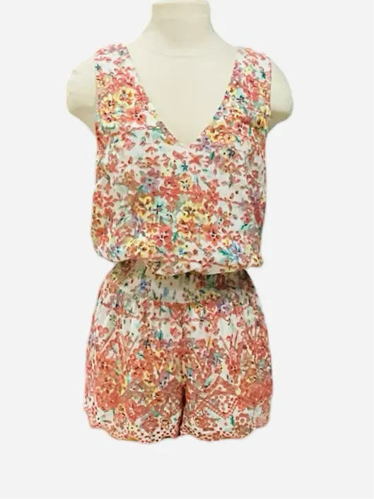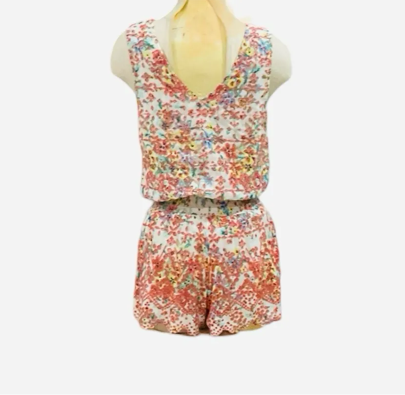 Peach multicolor shorts romper with eyelet trim, elastic waist, SZM